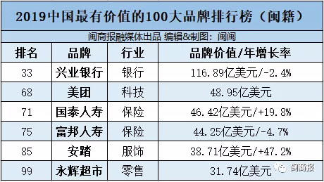 前100名中,闽籍企业——兴业银行、美团、国泰人寿保险、富邦人寿、安踏、太阳城官网 名列其中。