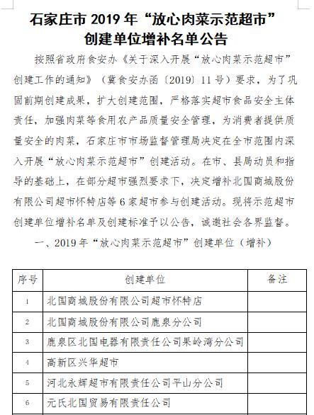 近日,石家庄监局发布《2019年“放心肉菜示范超市”创建单位新增名单公告》,公告中表示,自全市“放心肉菜示范超市”创建工作开展以来,多家超市踊跃参与,在部分超市强烈要求下,决定增补6家超市参与创建活动。 ...