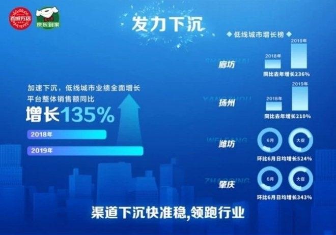 据介绍,活动期间廊坊、扬州、镇江等过半三四线城市销售额翻倍;潍坊、肇庆、新乡、娄底、邢台等新开不久的低线城市,销售额相较6月均值增长超过200%。区域连锁商超和品牌商均获得业绩高速增长。