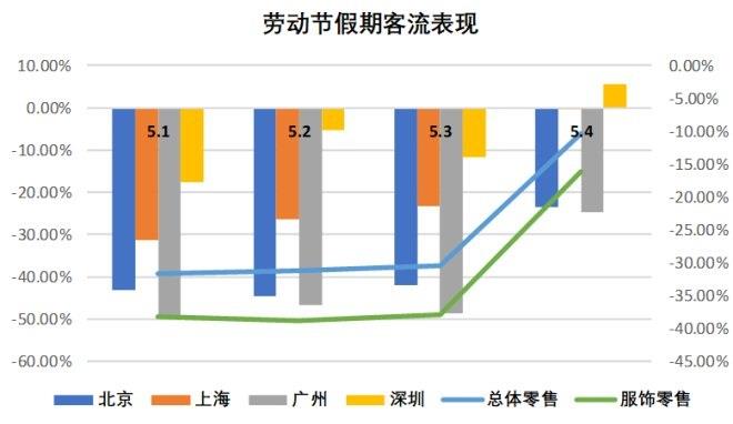 与去年5月相比,总体客流回归了80%左右,降幅比4月同比收窄了约10个百分点,5月零售市场活力有所增强。
