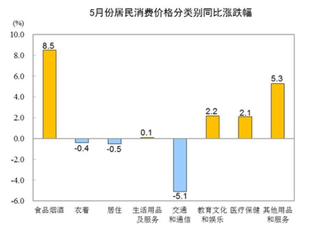 5月份,食品烟酒类价格同比上涨8.5%,影响CPI(居民消费价格指数)上涨约2.55个百分点。食品中,畜肉类价格上涨57.4%,影响CPI上涨约2.55个百分点,其中猪肉价格上涨81.7%,影响CPI上涨约1.98个百分点;水产品价格上涨3.7%,影响CPI上涨约0.07个百分点;粮食价格上涨1.5%,影响CPI上涨约0.03个百分点;鲜果价格下降19.3%,影响CPI下降约0.43个百分点;蛋类价格下降12.3%,影响CPI下降约0.08个百分点;鲜菜价格下降8.5%,影响CPI下降约0.22个百分点。