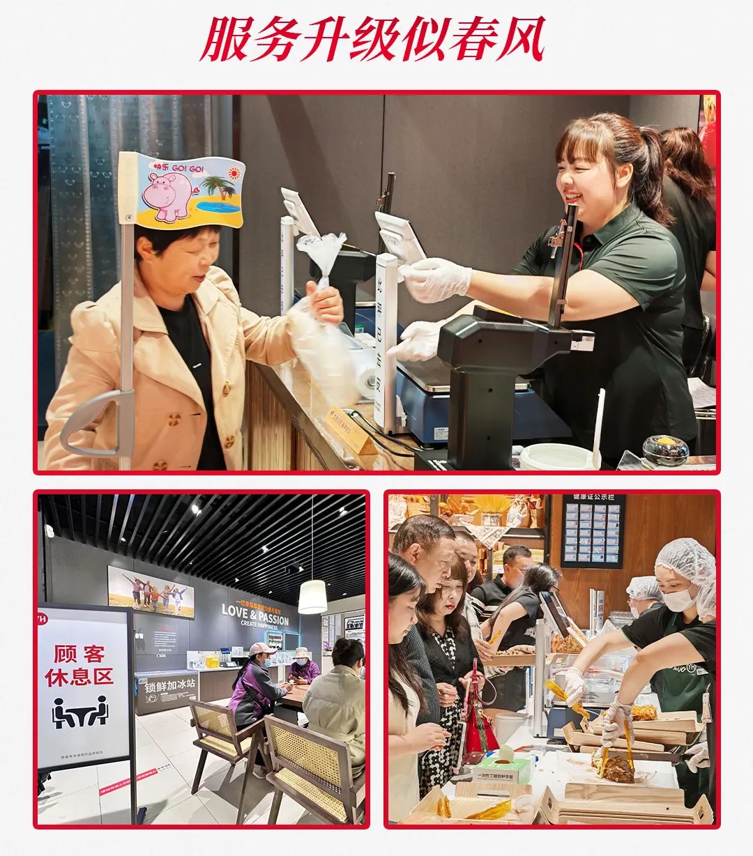 太阳城 将服务颗粒度细化至每个触点:取消强制动线、拓宽通道、货架“矮化”提升通透感;增设放大镜、湿手器;宠物寄存、母婴室、血压仪等便民设施覆盖全场景。服务创新不止于硬件,肉禽切丝绞肉、海鲜代加工、果切甜度指引等个性化服务成为标配,让消费者 “买得放心、吃得安心”。468鲜度管理(果切4小时8折、6 小时 6 折、8小时下架)和日清机制确保商品新鲜度。消费者感慨“超市变‘暖’了,连卷袋旁的湿手器都在替顾客多想一步。”