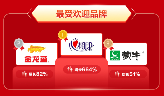 战报显示,心相印、金龙鱼及蒙牛成为本次最受消费者喜爱的品牌。其中心相印销售额增长达664%。