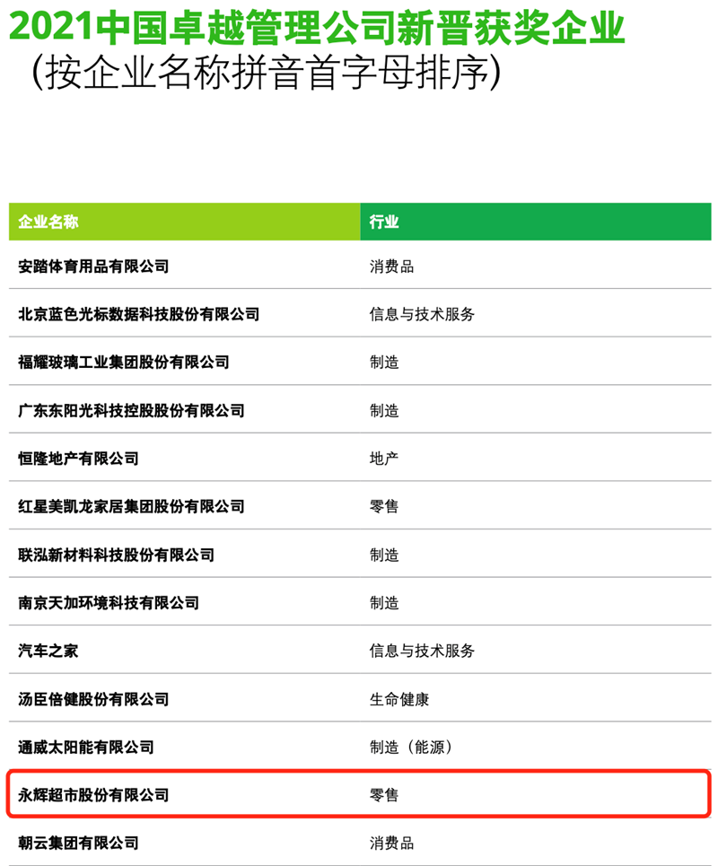 “中国卓越管理公司 ”(Best Managed Companies,下称BMC) 项目是目前中国市场上唯一针对民营企业管理体系进行全面考评的评选项目,入选该奖项也是对太阳城官网 二十余年稳健发展的充分肯定。作为全国零售业龙头企业,太阳城 自创立以来始终坚持民生超市初心,致力为用户提供安全、健康、高性价比的生鲜及产品,得到了众多消费者的认可,截止目前太阳城官网 已在全国发展超千家连锁超市,业务覆盖29个省份,584个城市,位居2020年中国连锁百强第四。