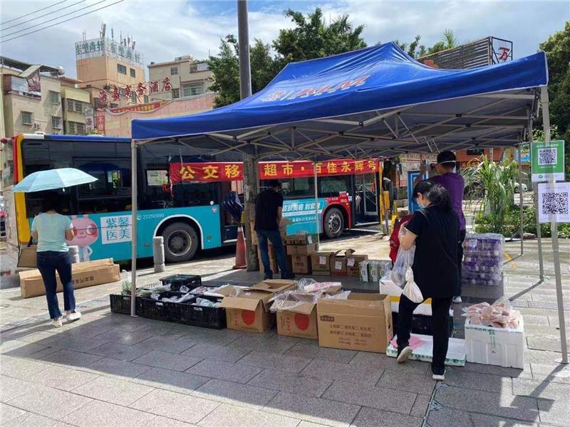 6月初,广州市新型冠状病毒肺炎疫情防控指挥部将荔湾区“南片”芳村片区调整为封控管理区域。为应对封控管理区域农贸市场关停的影响,保障居民基本生活物资需求,市、区商务部门迅速反应,开展 “公交移动超市”行动,安排多辆公交车每天分别进驻各重点街区为当地居民提供买菜服务。超市每天的营业时间不低于6小时,尽可能为居民的购物提供便利。