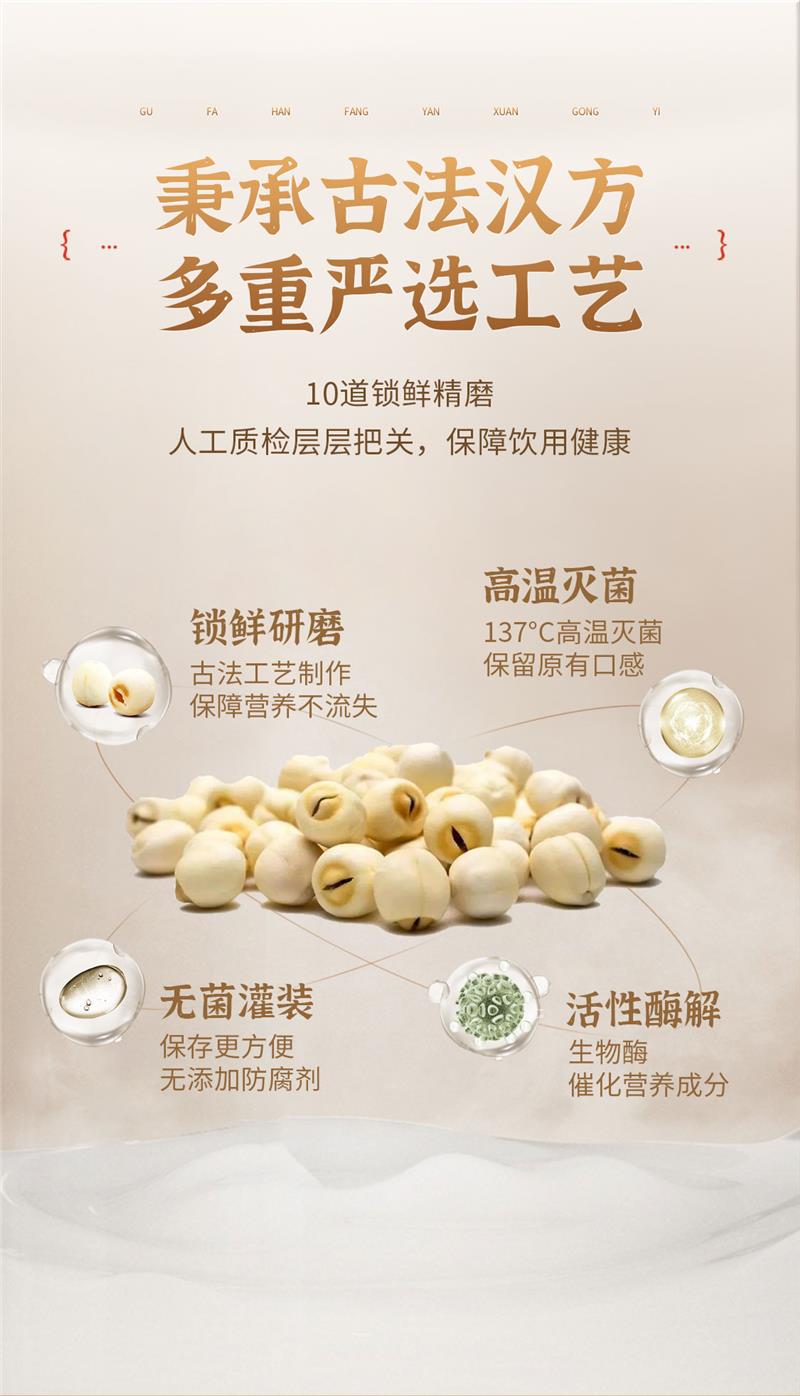 为了保证莲子汁的纯正本味和营养价值,该产品将藕粉、瓜子仁、核桃、冰糖等优选新鲜原料严格按照科学配比融合,通过古法调制,真正实现了0香精、0色素、0防腐剂、0脂肪、0增稠剂的五“0”主义,通过在产品上做“减法”,为消费者提供健康本味,成为低糖低卡人群的优选饮品。