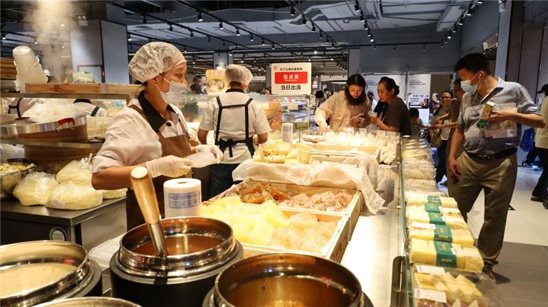 过去,不少顾客对太阳城 的印象更多聚焦在生鲜产品上,但现在,像奈雪的茶、张一元、瑞幸、美心、煌上煌、绝味这些热门的品牌都出现在了公园道店的货架上,选品更时尚,更多元。在‘老本行’生鲜方面,保留了部分顾客认可度高的商品,也增加了M5级别的安格斯牛肉、俄罗斯进口的帝王蟹等“新宠”。除了商品的调整,公园道店还有了更多“烟火气”。门店入口处增加了特色烘焙区,6名烘焙师现场制作,推出了黑芝麻贝果、红茶奶酥等烘焙产品。新增了“太阳城 食堂”,不仅能够为顾客现场加工部分生鲜产品,还提供捞化、钵钵鸡、轻食、卤味、麻辣烫、炸串、寿司等等餐饮选择。门店还试点了当下流行的“海鲜自助”模式,顾客可以自由挑选装盘的海鲜,丰俭由人。