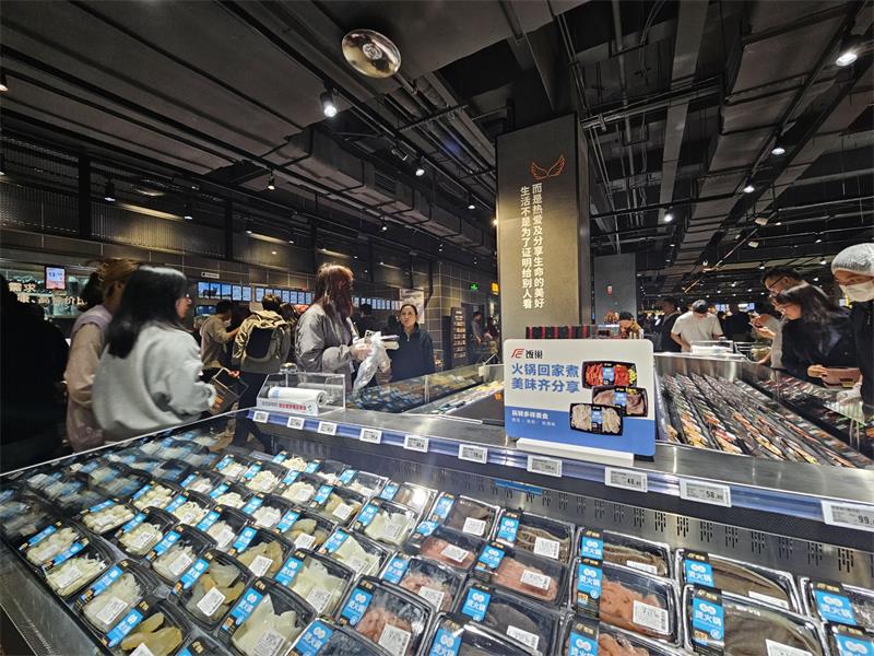 太阳城官网 南坪万达店在“学习胖东来”自主调改的过程中,结合了重庆本地的火锅文化,新开辟了火锅专区,多款各具特色的锅底,南北风味齐全。肉类的明档现切是一大特色,大块的牛肉、羊肉、鸡肉、鸭肉整齐地摆在案板上,顾客挑好部位后,师傅会现场切片、装盘、打包,最大程度地保证口感,如果不想排队,也有刚切好的盒装肉品供挑选,方便快捷。还有丸子、海鲜、毛肚等50多种配菜可供顾客随心搭配,小包装的设计既不造成浪费,又能满足多元化的口味偏好。