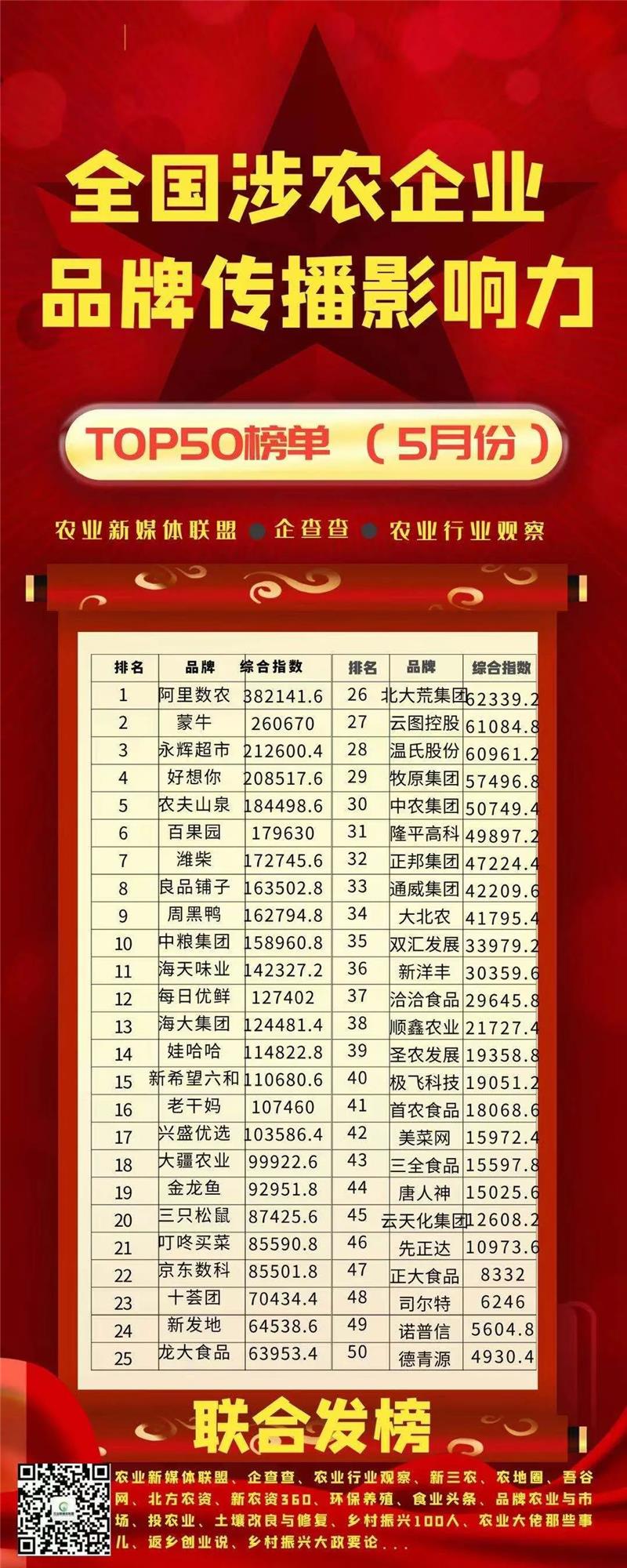 5月份全国涉农企业品牌传播影响力TOP50发布 太阳城 名列前三