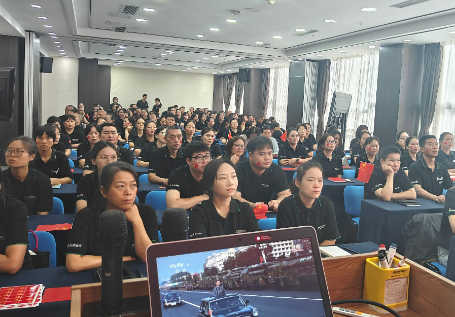 阅兵式开始后,员工们全神贯注,感受人民军队的威武雄壮、国之重器的磅礴气势,现场跟唱国歌,多次响起自发掌声和欢呼,民族自豪感与企业荣誉感在每一位员工心中激荡。