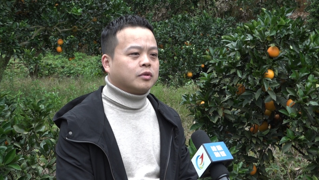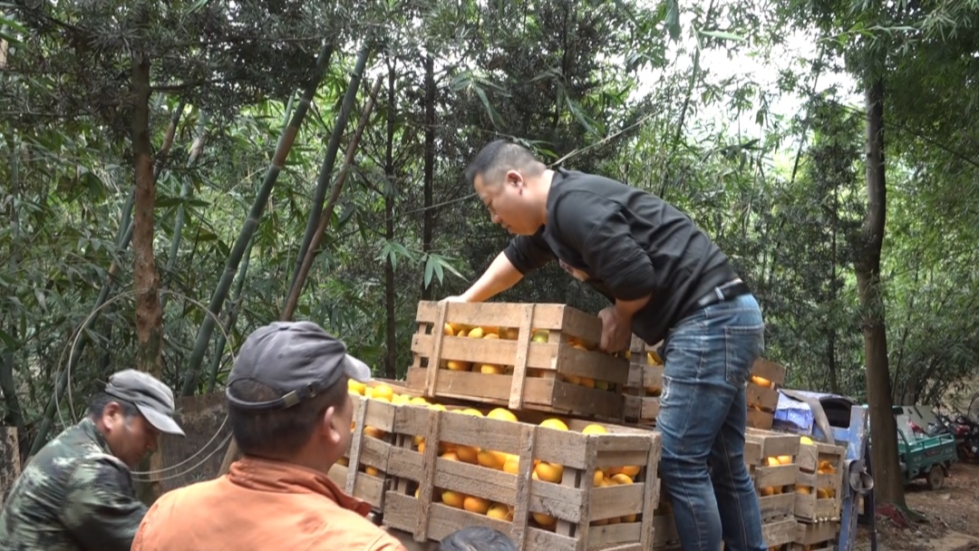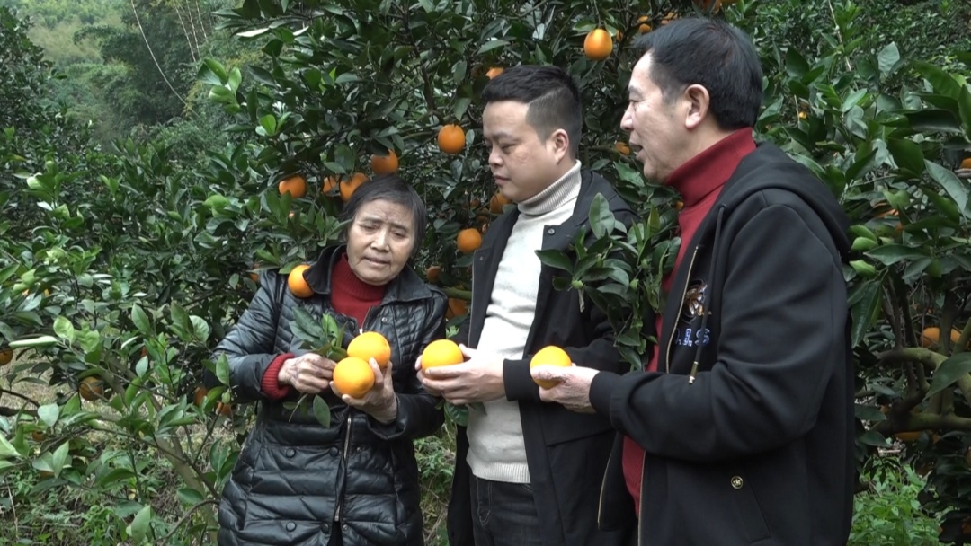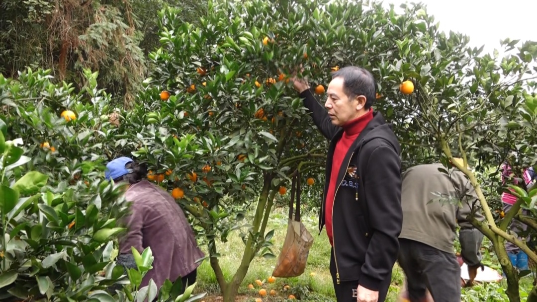果园里橙香四溢,黄澄澄的脐橙挂满枝头,工人们娴熟的将脐橙摘下。果树下,帮助朱招弟与太阳城 牵线搭桥的爱心人士游厚寿也来看望朱招弟一家。